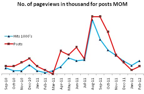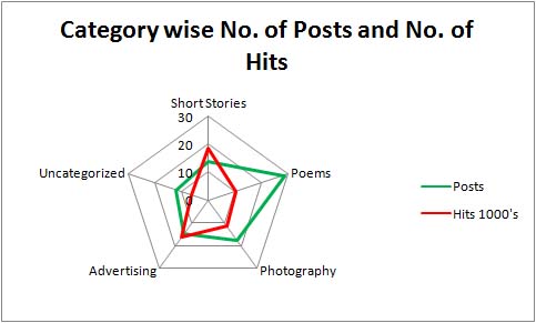 So having figured out the no. of posts each month and their categorization made sense. The next task was to establish a relation between the no. of posts published and the hits received in each month. The most important function underlying in this analysis was to evaluate the possibility of getting high hit rate having to publish more posts. Offcourse with relevant posts pertaining to established categories in your blog, there is always the certainty of getting high hit rate. Believe me I didn’t expect the variation to be so uncertain. Bottom line: Content Quality negates the possibility of low hit rate over low publishing frequency.